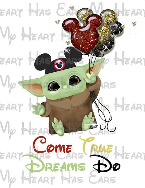 Baby Yoda with Mickey Mouse balloons Dreams come true boy dark colors image png digital file sublimation print t-shirt design