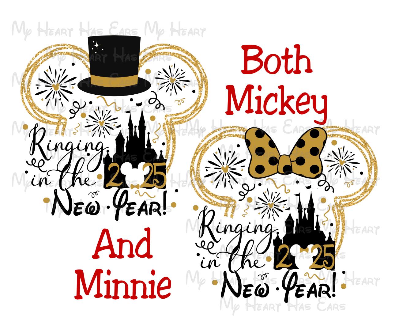 Ringing in the New Year 2025 Mickey and Minnie Mouse glitter ears family image png digital file sublimation print t-shirt design